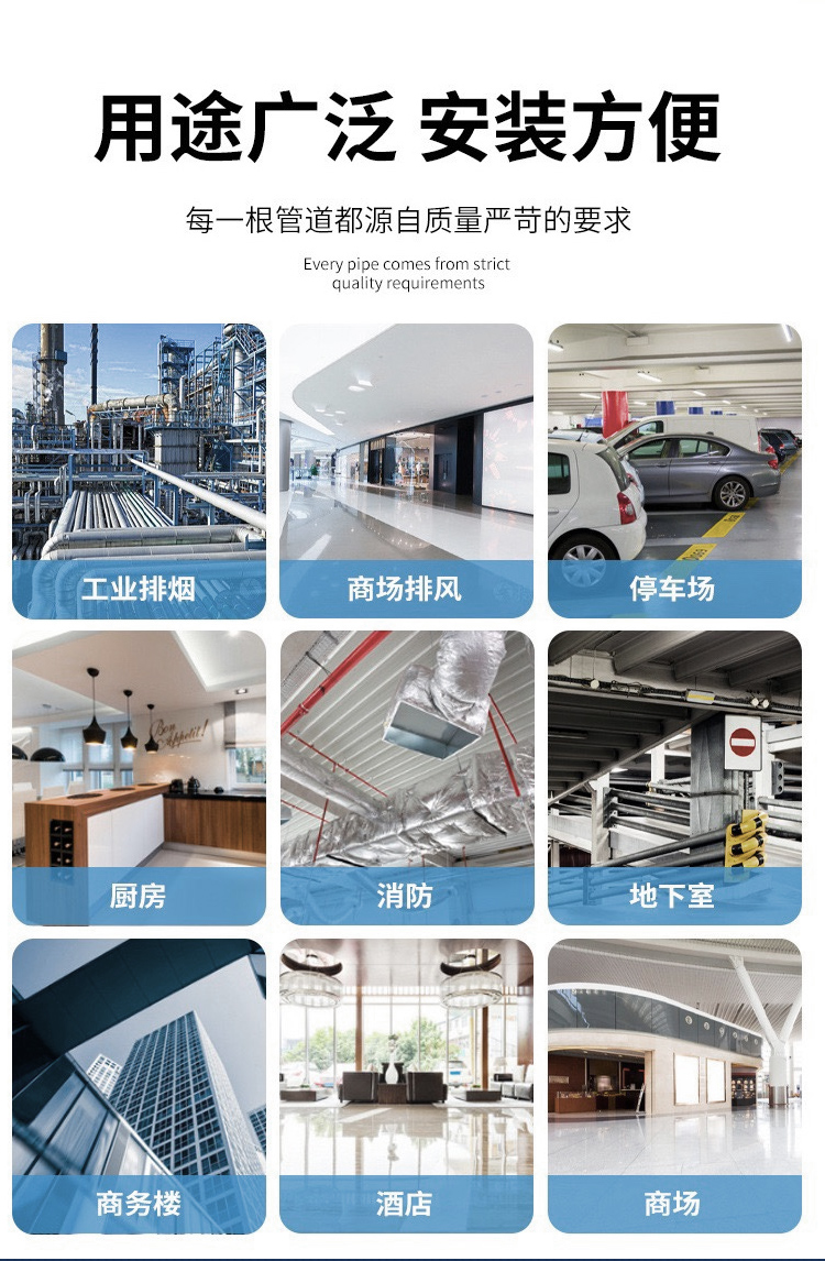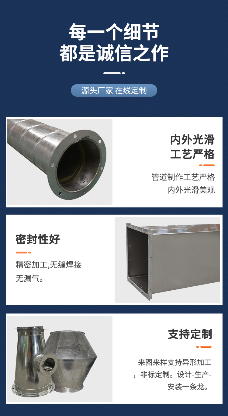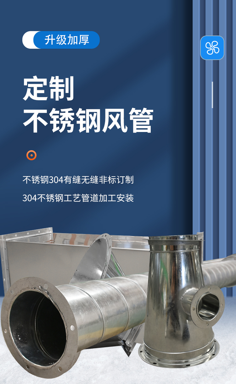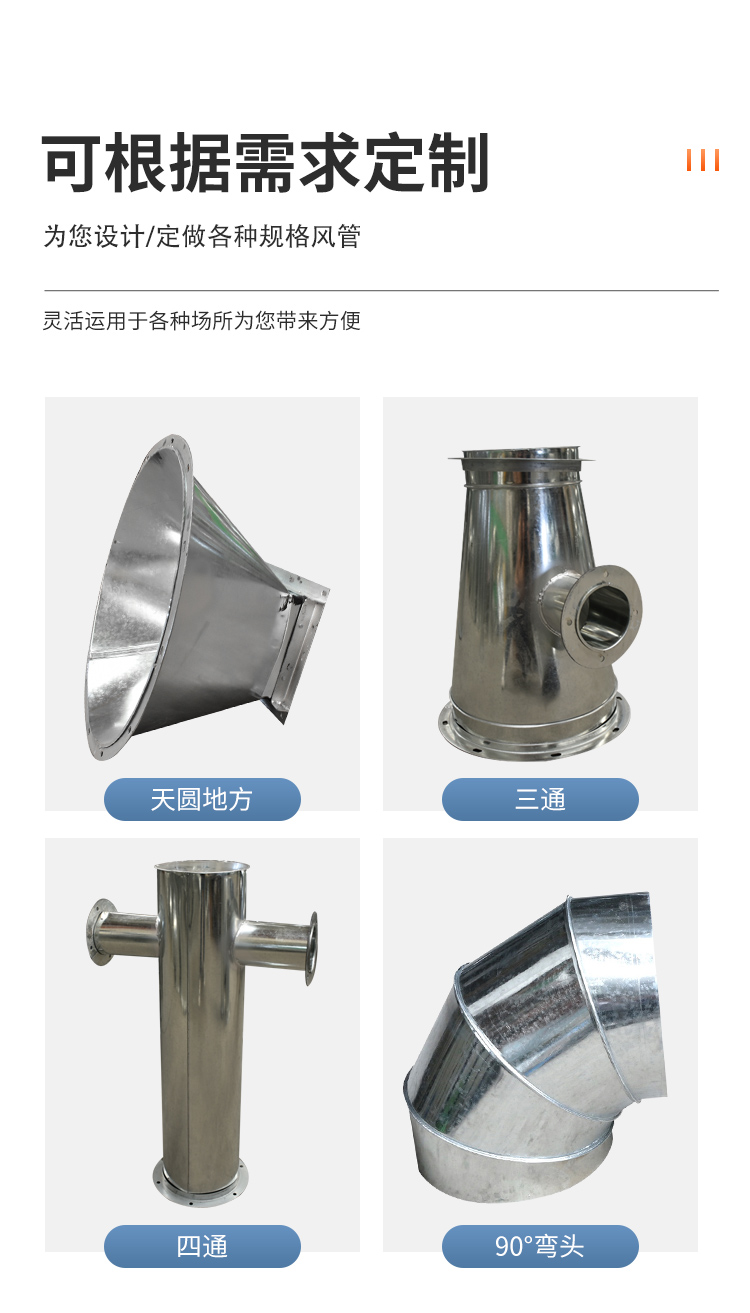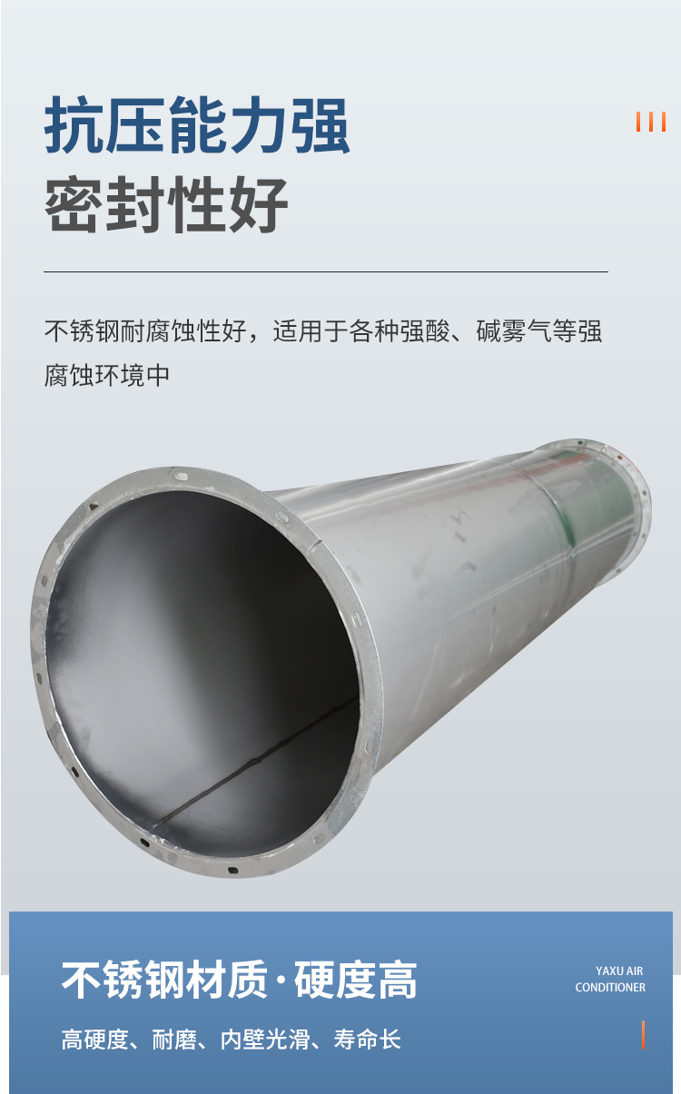 不銹鋼天圓地方安裝方便,連接點少,通風(fēng)阻力小,通風(fēng)噪聲小,強度與剛性均好。螺旋風(fēng)管無氫脆、無溫度危害,耐腐蝕性好,并且采用熱鍍鋅方法完成,適用于各種強酸、堿霧氣等強腐蝕環(huán)境。